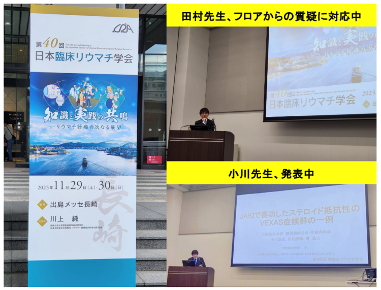 2025.12.05 アレルギー・リウマチ内科 第40回日本臨床リウマチ学会で発表しました。 2025年11月29日・30日に長崎で開催された第40回日本臨床リウマチ学会で小川恭生先生と田村誠朗先生が発表しました。質問も多くあり、関心を持ってもらえたことがよく伝わって来ました。東直人先生は関節リウマチの一般演題の座長を務めました。